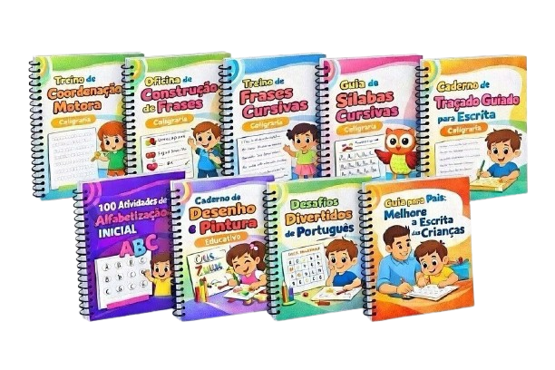 São 5 módulos com mais de 350 páginas para aprender e treinar letra cursiva